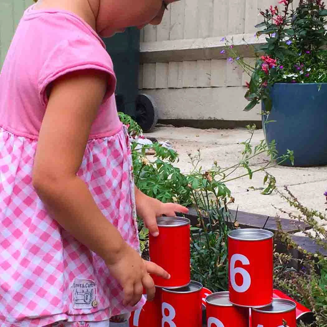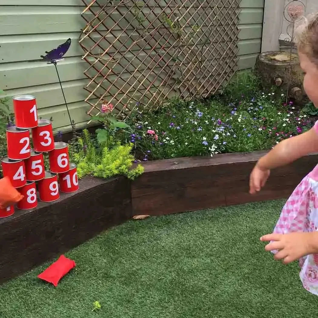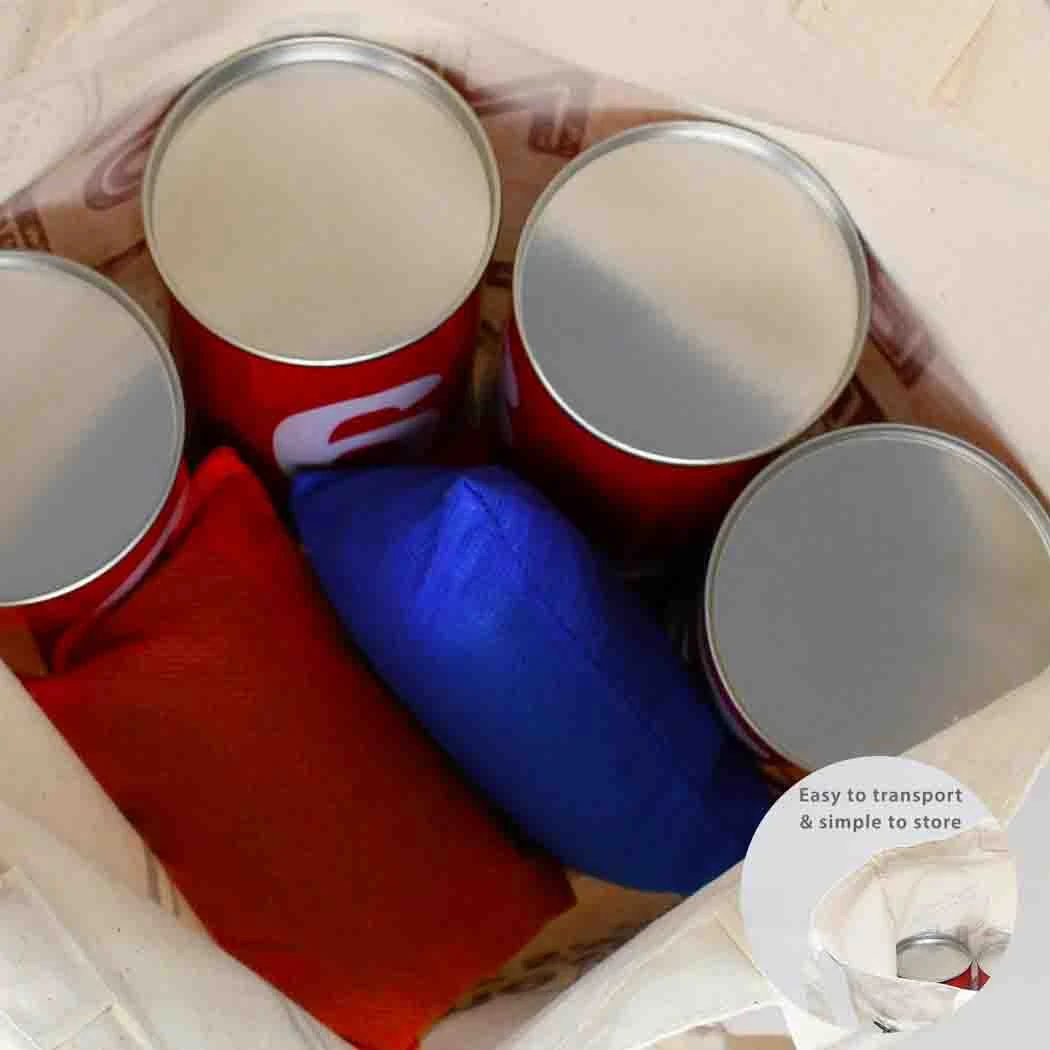 - Complete set:Â Includes 10 durable tin cans and 3 soft beanbags for safe play.